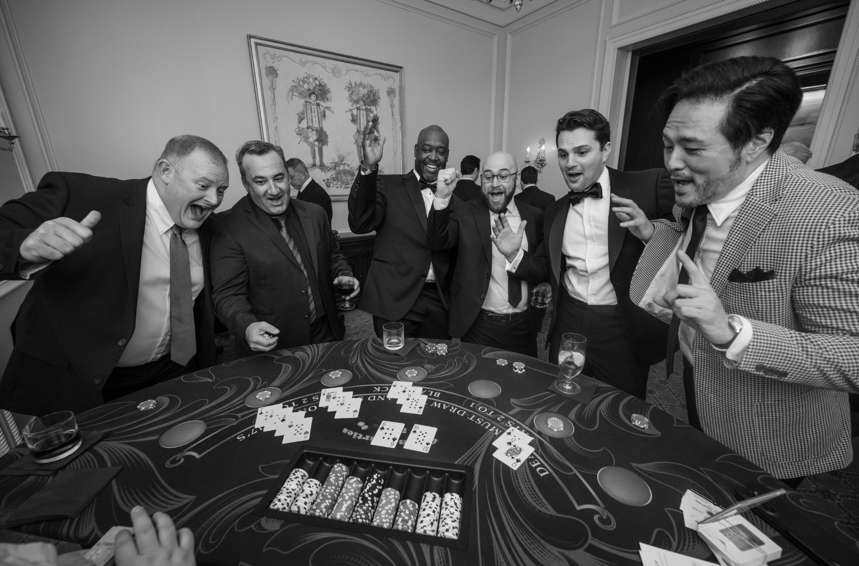 We intentionally shifted the color palette from blue and gold to red and gold by the final evening. It was subtle but powerful. Red tablecloths. Playing cards at each seat. Gold napkins. Candlelight. Starburst centerpieces.